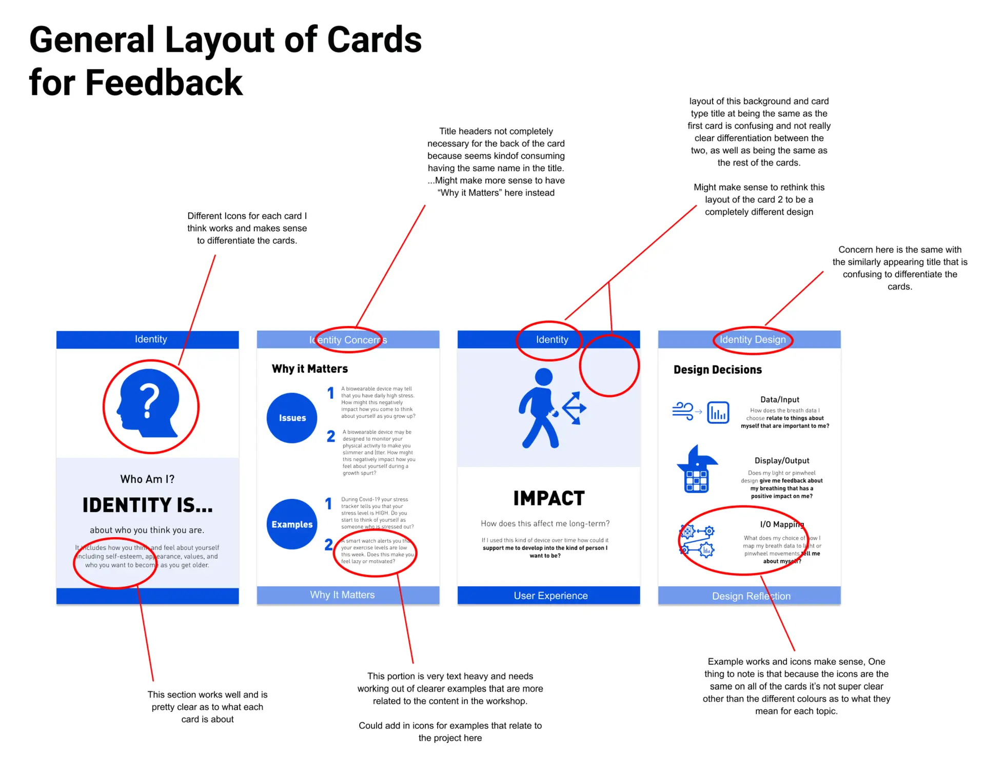 We ended up adding in more descriptive footers and headers and clearly numbering the cards so that it would make it more clear of which should be reflected on first and what the central focus was.